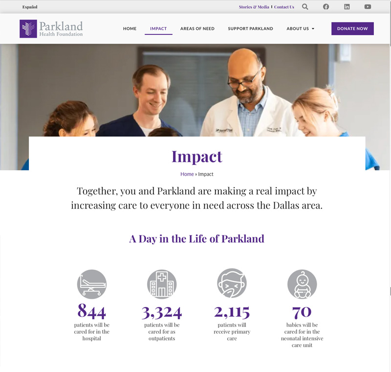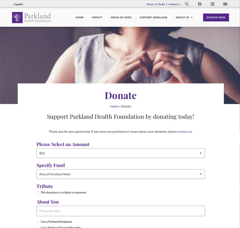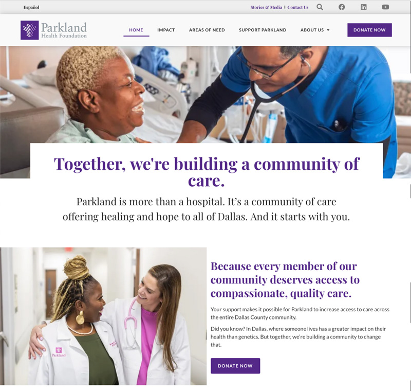Our partnership with PHF came at a pivotal moment, as the foundation sought to revitalize its online presence and enhance its connection with donors. With a fresh name and brand, PHF aimed to tell a more compelling story—one that illustrates the critical role donations play in driving meaningful change in community health outcomes. Together, we embarked on a mission to simplify the giving process, humanize the experience, and inspire more people to contribute to Parkland’s vital work.